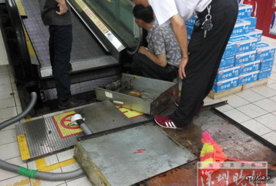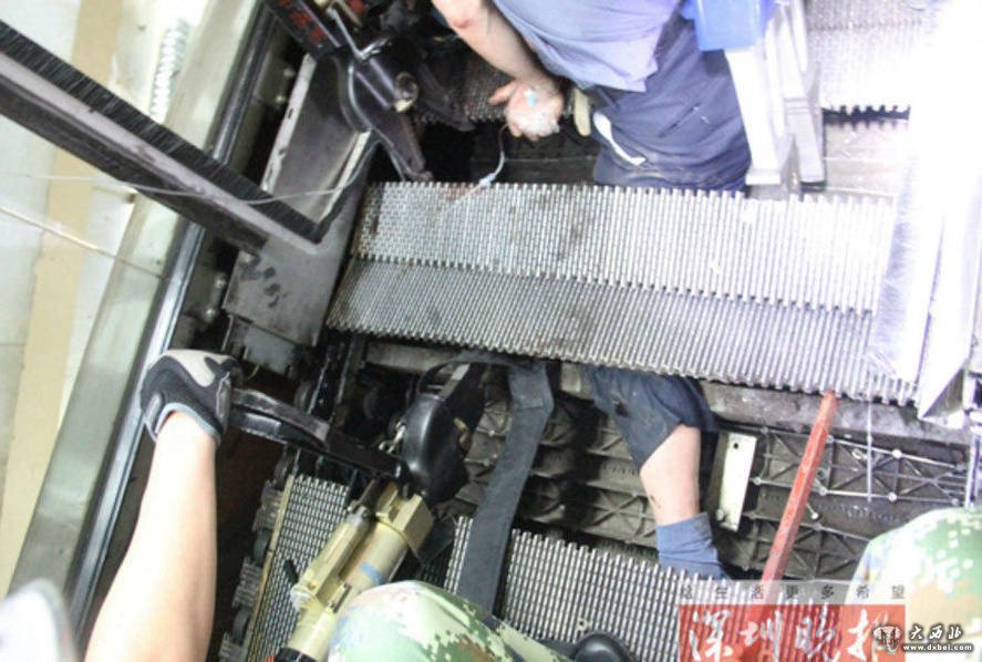 他介绍,在腿脚被陷入电梯后,连忙大叫“赶快停电梯”,但周围没看到人,过了一会儿才被人发现,而电梯也自动停止运行了。回想起长达40分钟的救援,刘大爷似乎还心有余悸,皱起眉头,连连摇手,称“脚痛的没有感觉了!”事发后,宝安区市场监督管理局介入调查。中午时分,在涉事电梯现场,记者看到几名工作人员在电梯踏板下方,疑似在维修。电梯旁还有一块不完整的梯级踏板。好端端的电梯,为何踏板突然就掉了?“吃人”电梯究竟有没按规定进行维保和检查?
