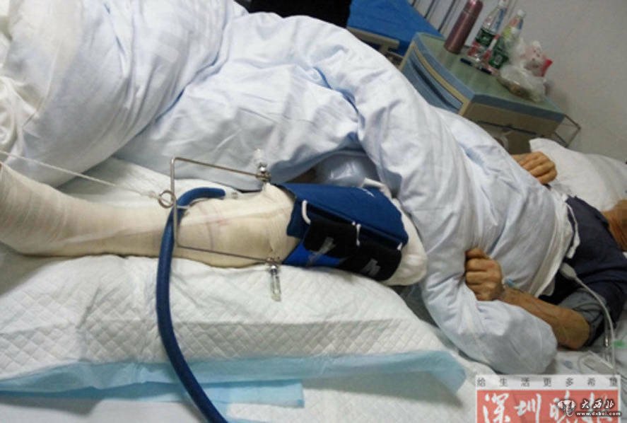 刘大爷左大腿骨折,被绷带紧紧包扎着。或许是经过了一段时间的休息,刘大爷的精神恢复得不错,讲起早上的情况,也还很激动。刘大爷介绍,今(5月24)早和老伴一起去超市买洗衣液,后来独自一人去搭电梯,在超市2楼的下行电梯,电梯踏板突然裂开,腿踏空后就陷了进去。“要躲开都来不及呀!”刘大爷激动地说。李其聪摄。