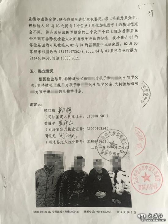 澎湃新闻记者从盖有印章的鉴定意见书看到,结论为“排除被检父渐先生为孩子渐某某的生物学父亲,支持被检父魏某为孩子渐某某的生物学父亲,支持被检母张某为孩子渐某某的生物学母亲”。