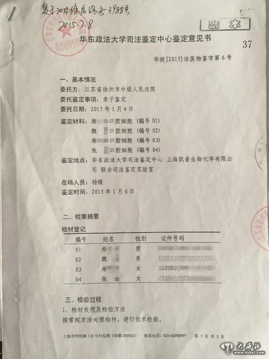 2015年1月,渐先生、魏某、张某和渐某某四人,前往华东政法大学司法鉴定中心做了亲子鉴定,鉴定材料为四人的口腔细胞。