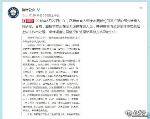 5月27日傍晚,浙江台州市路桥区公安分局官方微博发布消息:当天中午,22日发生的南官大道夜市因纠纷引发打架的部分涉案人员到案。