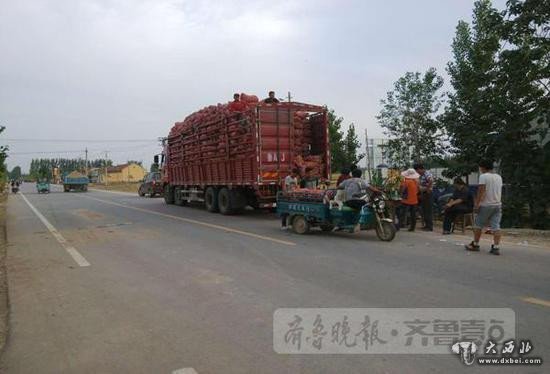 在商河县白桥镇亓家官庄村,不少大车停在村头收大蒜。