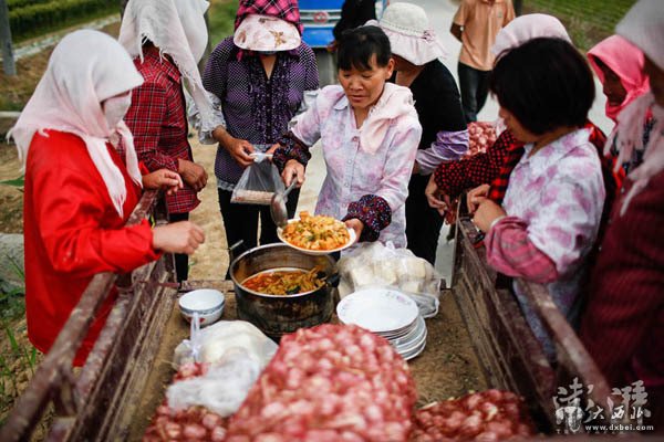 2016年5月20日,山东金乡胡集镇,女劳工们在地头吃饭 。劳工的午饭一般由蒜农供应。