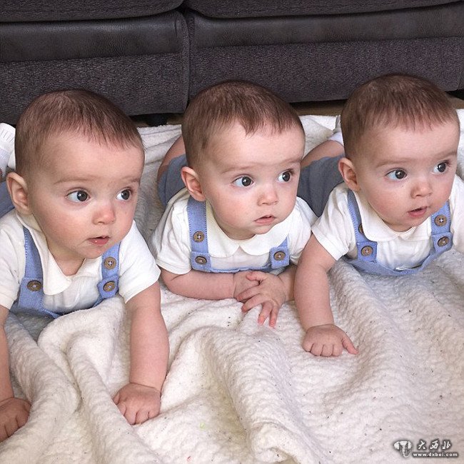 英国一位妈妈晒同卵三胞胎照片,现在10个月大的他们长得可爱极了。