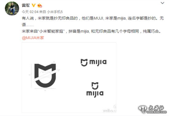 小米CEO雷军在微博上表示“有人说,米家就是抄无印良品的,他们是MUJI, 米家是mijia, 连名字都是抄的,无语。”雷军称,米家来自“小米智能家庭”,拼音是mijia, 和无印良品有几个字母相同,纯属巧合。