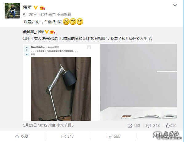 【环球科技报道 周涛】日前,小米发布了旗下新品LED 护眼灯,售价为169元。而在昨天,小米生态链产品规划总监@孙鹏_小米发布微博称,“知乎上有人说米家台灯和宜家的某款台灯‘极其相似’,我看了都开始怀疑人生了。”对此,小米CEO 雷军转发该微博调侃“都是台灯,当然相似”。