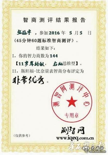 测评证书显示,张涵宇的智商高达144。