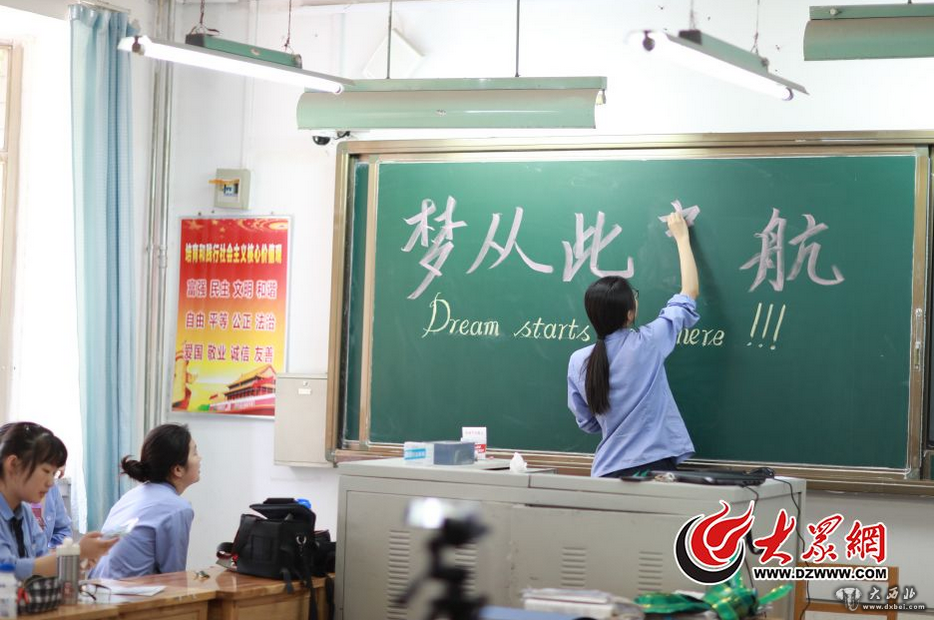 6月4日,山东省实验中学高三14班的教室内,一名学生在黑板上写下“梦从此启航”的标语。