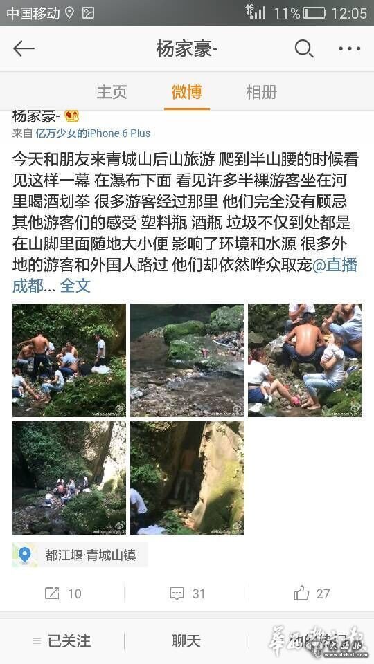 华西都市报讯(客户端记者 李智)6月5日,新浪微博网友@杨家豪-发帖称,当天他在四川成都青城山景区后山游玩时,碰上了一群奇葩游客:这群游客坐在一处水潭旁用餐,当场喝起了啤酒白酒,猜起了拳,甚至有一名男性游客,在大庭广众之下随地小便,十分不雅。