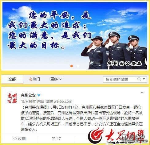大众网济宁6月9日讯 据兖州公安官方微博消息,6月8日21时17分,济宁兖州区和馨家园西区门口发生一起抢孩子的警情。接警后,兖州区局城郊派出所民警出警到达现场,欲将一名被群众现场抓获的犯罪嫌疑人带走,个别人鼓动一些不明真相的群众围堵警车,经公安机关现场工作,目前事态已平息,公安机关正在全力追捕其余在逃嫌疑人。