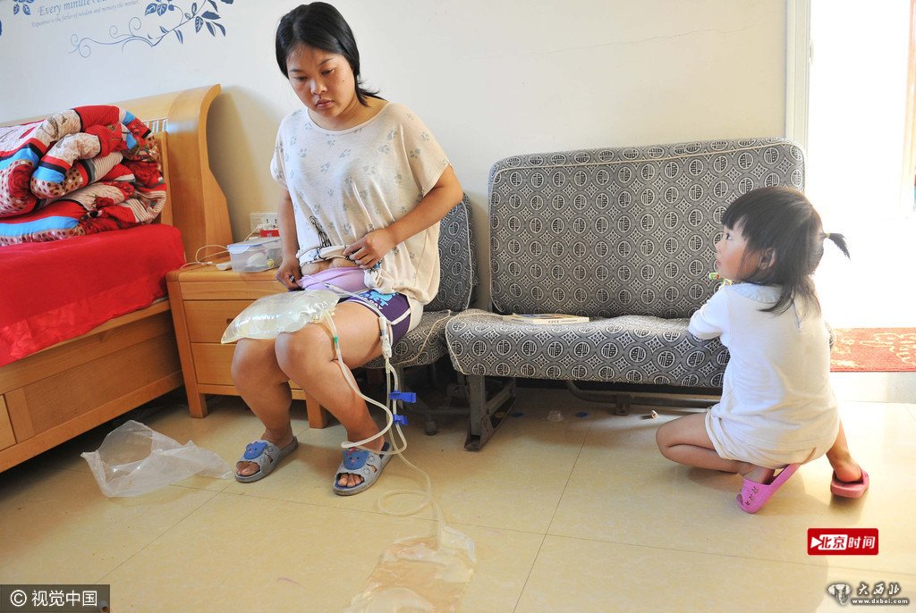 6月5日,浙江金华,在兰溪游埠镇伍家圩村一间普通民房里,31岁的廖艳正在丈夫协助下做腹膜透析。她是一位尿毒症患者。在上海大医院治疗花费了五十多万元后,只能回到家里,自助做腹透以维持生命。