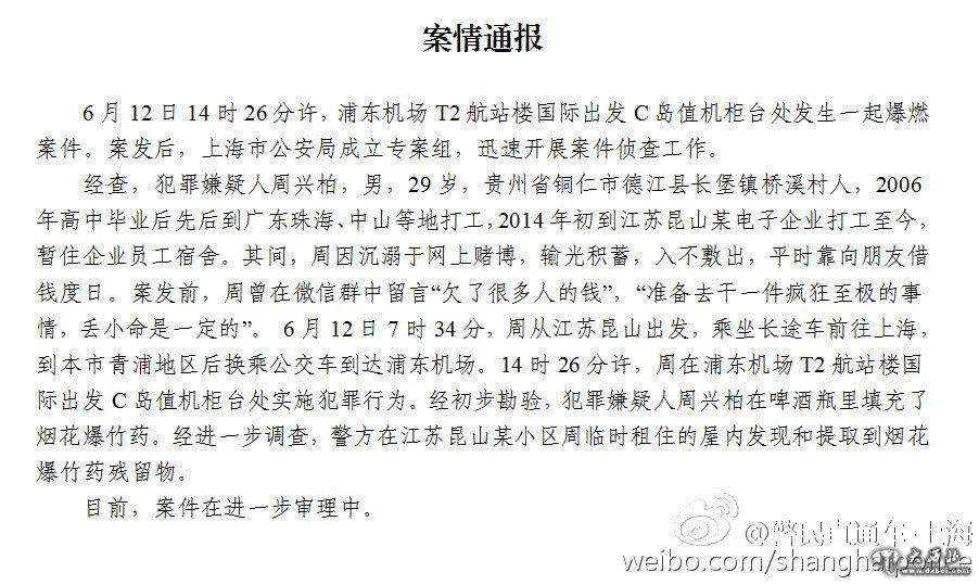 经查,犯罪嫌疑人周兴柏,男,29岁,贵州省铜仁市德江县长堡镇桥溪村人,2006年高中毕业后先后到广东珠海、中山等地打工,2014年初到江苏昆山某电子企业打工至今,暂住企业员工宿舍。期间,周因沉溺于网上赌博,输光积蓄,入不敷出,平时靠向朋友借钱度日。案发前,周曾在微信群中留意“欠了很多人的钱”,“准备去干一件疯狂至极的事情,丢小命是一定的”。6月12日7时34分,周从江苏昆山出发,乘坐长途车前往上海,到本市青浦地区后换乘公交车到达浦东机场。14时26分许,周在浦东机场T2航站楼国际出发C岛值机柜台处实施犯罪行为。经初步勘验,犯罪嫌疑人周兴柏在啤酒瓶里填充了烟花爆竹药。经进一步调查,警方在江苏昆山某小区周临时租住的屋内发现和提取到烟花爆竹药残留物。