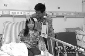 6月11日,湘潭市,刘术良正在病床前照顾不慎坠入地下排水沟的妻子胡菊元。图/通讯员朱亚军