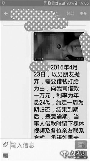 日前,有网友通过微博爆料称,有人通过一款熟人间网络借贷平台提供“裸条放款”,即进行借款时,以借款人手持身份证的裸体照片替代借条。当发生违约不还款时,放贷人以公开裸体照片和与借款人父母联系的手段作为要挟逼迫借款人还款。一些借款的女大学生诉称遇到了这样的麻烦。