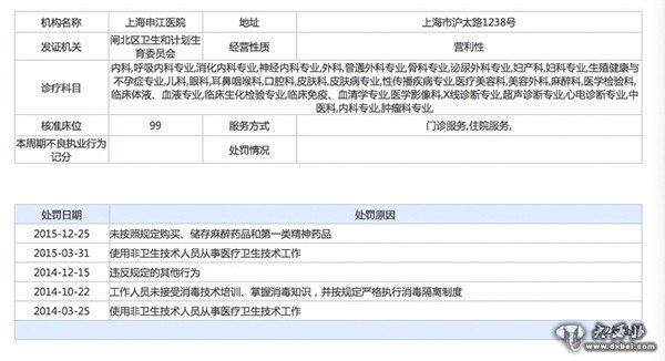 据上海市卫生和计划生育委员会监督所官网显示,在2015年3月31日、2014年3月25日,上海申江医院因“使用非卫生技术人员从事医疗卫生技术工作”被处罚。在2014年至2015年期间,该医院还因其他问题被处罚3次。