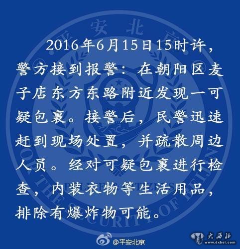 @北京青年报:【#美国驻华使馆门前发现疑似爆炸物#】今天下午,美国驻华使馆门前发现可疑爆炸物。多名现场网友拍摄的照片显示,多名特警在现场聚集,身穿防爆服的排爆人员正在处理地上的包裹。据现场目击者称,疑似爆炸物发现于下午3时左右,在一辆三轮摩的上面发现的。北京青年报记者了解到,目前警方已经处置完毕,包裹并不是爆炸物,而是衣服,稍后将会就此事发布通报。