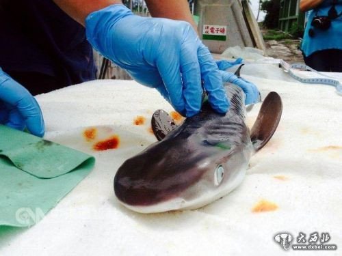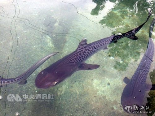 台东长滨定置渔网,13日闯入的母虎鲨,肚子圆滚滚,渔民剖腹后救出38只小虎鲨,送到台东水试所东部海洋生物研究中心;今天上午又有一只母虎鲨进入定置网,同样有37只小虎鲨。东部海洋生物研究中心主任何源兴表示,连续2只母虎鲨闯入定置鱼网,分析最近可能是虎鲨的繁殖季节,母鲨要生小鲨时,会靠近岸边,岸边食物比较多,因此误闯定置渔网。图为幼鲨。
