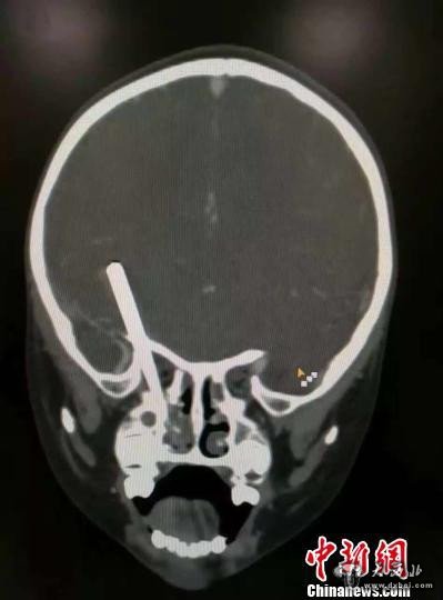 医生通过小宇头颅CT片发现,这根“肇事”的筷子经小宇的口腔穿入,穿过右侧鼻腔、上颌窦、眼眶后部、视神经、进入右蝶骨小翼边缘部直插右侧额叶底部,插入体内约8cm,进入脑组织内约3厘米,小宇的右侧视神经被切断。