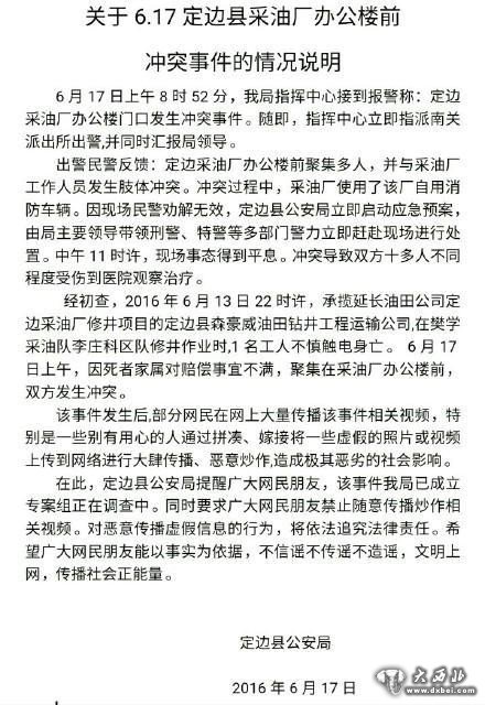 6月17日晚,定边县公安局通过官方微博发布说明称,经初查,6月13日22时许,承揽延长油田公司定边采油厂修井项目的定边县森豪威油田钻井工程运输公司,在樊学采油队李庄科区队修井作业时,1名工人不慎触电身亡。6月17日上午,因死者家属对赔偿事宜不满,聚集在采油厂办公楼前,双方发生冲突。