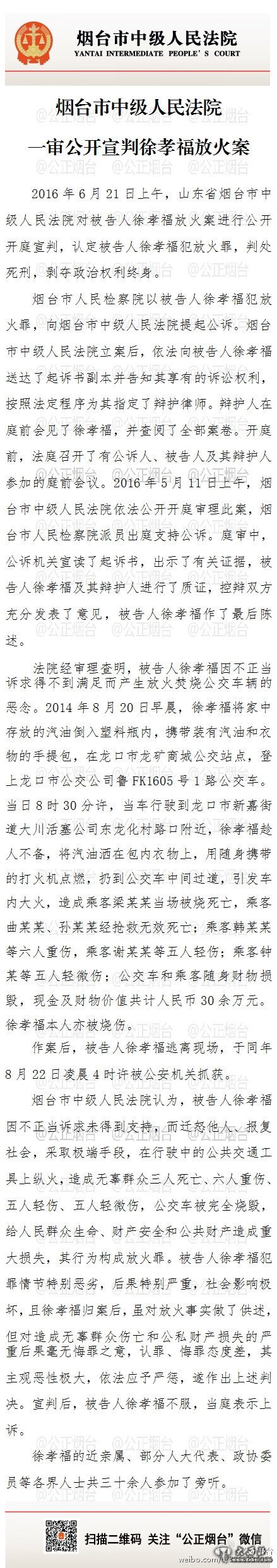 山东省高级人民法院官方微博@山东高法:【烟台公交车纵火案宣判 徐孝福一审被判处死刑】2016年6月21日上午,山东省烟台市中级人民法院对被告人徐孝福放火案进行公开开庭宣判,认定被告人徐孝福犯放火罪,判处死刑,剥夺政治权利终身。