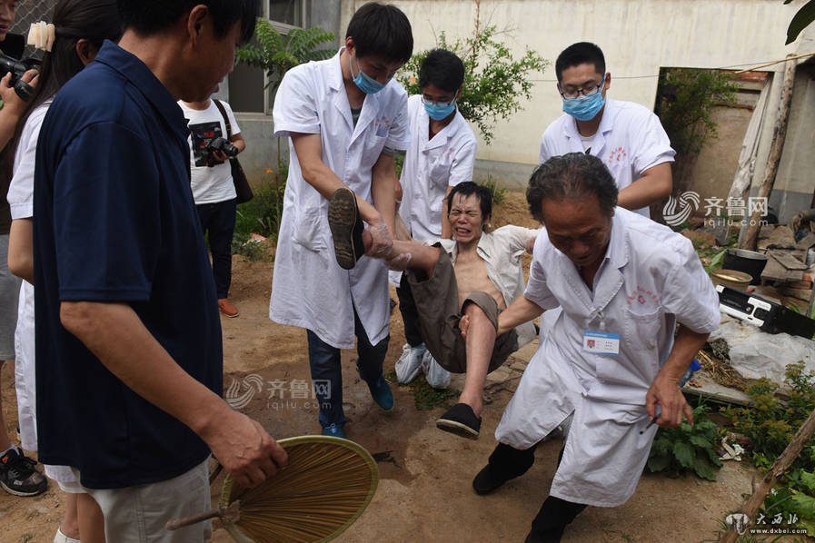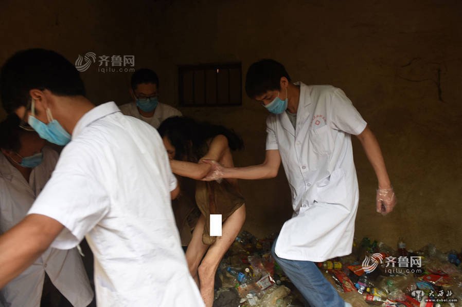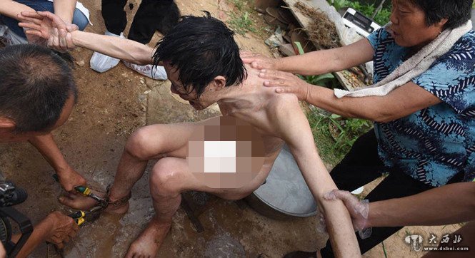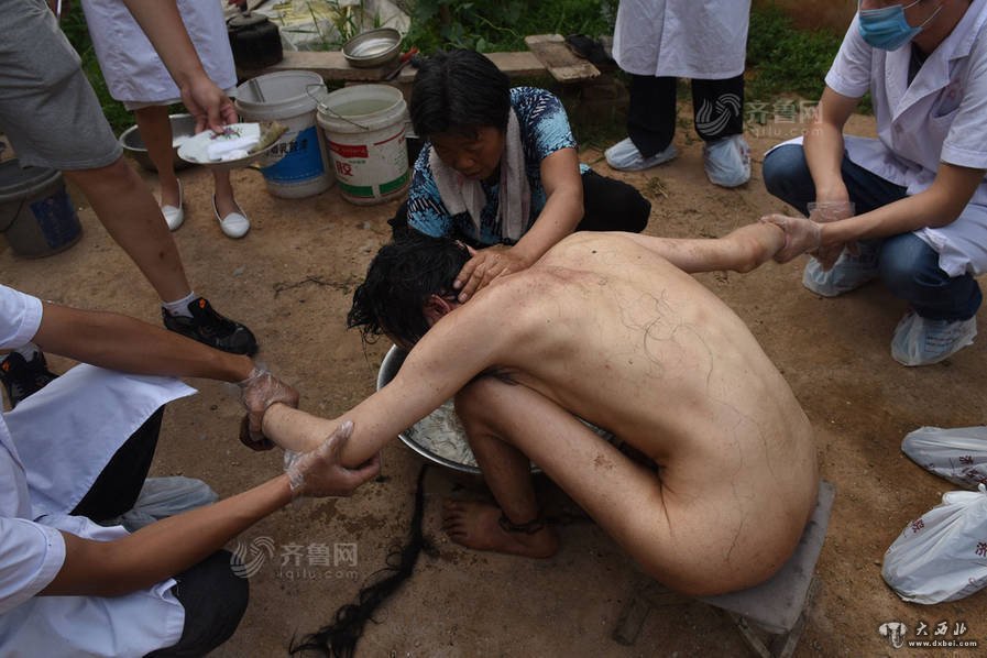 图为解锁后,母亲齐良英正在给吴强清洗身体。