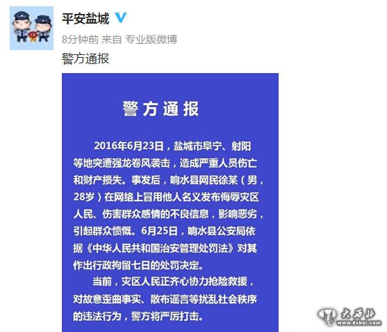 中新网6月25日电 据江苏省盐城市公安局官方微博消息,2016年6月23日,盐城市阜宁、射阳等地突遭强龙卷风袭击,造成严重人员伤亡和财产损失。事发后,响水县网民徐某(男,28岁)在网络上冒用他人名义发布侮辱灾区人民、伤害群众感情的不良信息,影响恶劣,引起群众愤慨。