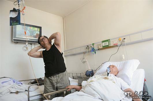 “我不放心请护工,母亲离世前曾嘱我要照顾好父亲。”于利说,有一年给父亲洗棉裤时滑倒,摔断三根肋骨,就用约束带把腰捆住照顾父亲。图为:陪护十年,困了累了就在父亲的病床边做做健身操