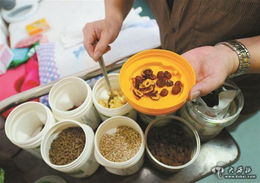 17日上午,记者走进武昌医院的老年病科病房,于利正在洗手间里给父亲做午饭,电饭煲里,香菇番茄瘦肉糊咕噜噜冒着热气。图为:搭配食药材熬汤