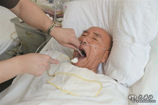 89岁的于父因病智商几乎为零,已认不出儿子。十年里,于利侍候父亲在病床上吃喝拉撒,一天都没离开。图为:清晨擦洗身子