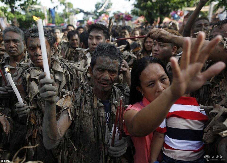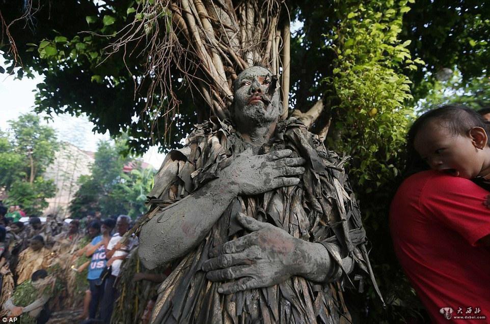 参加仪式前,这些裹着香蕉树叶的村民都会欢呼着在泥地里打滚。