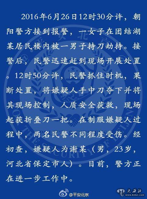 @平安北京 通报,2016年6月26日12时30分许,北京朝阳警方接到警报,一女子在团结湖某居民楼内被一男子持刀劫持。接警后,民警迅速赶到现场开展处置。12时50分许,民警抓住机会,果断处置,将嫌疑人手中刀夺下并将其现场控制,人质安全获救,现场起获折叠刀一把。在制服嫌疑人过程中,两名民警不同程度受伤。
