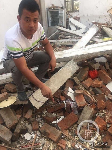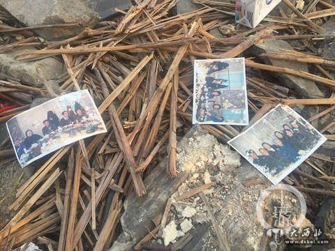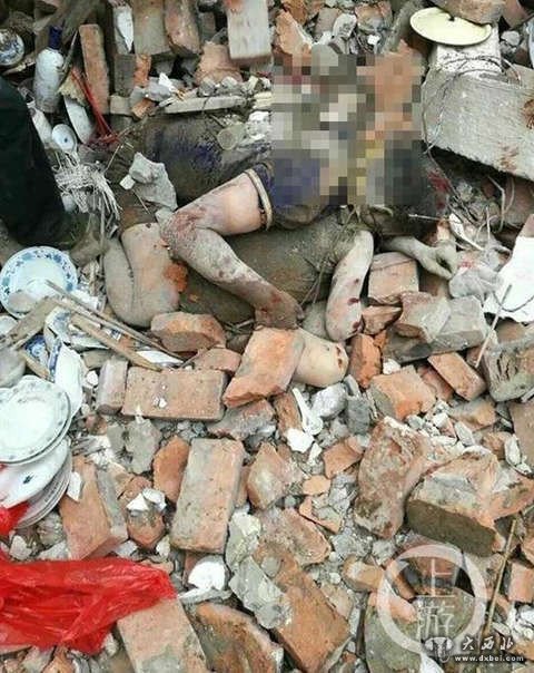 徐海峰找来一根棍子,将从屋内插上插销反锁的木门破开。几经寻找,才注意到脚下正对一两米外的砖瓦废墟中,隐约出现的人影。