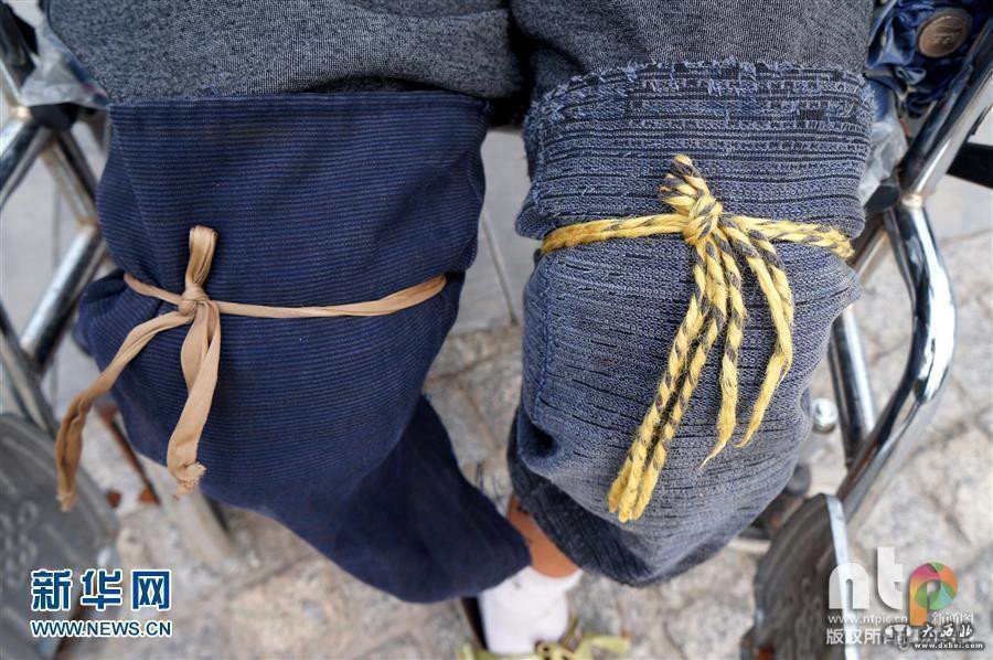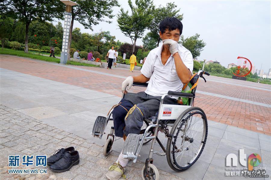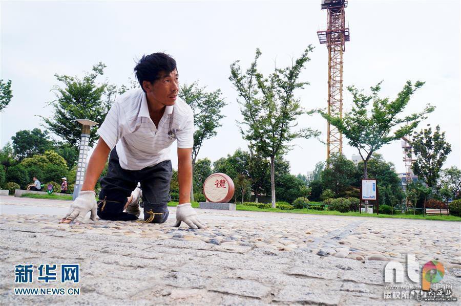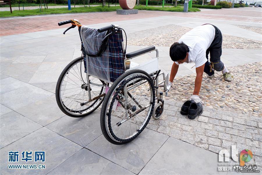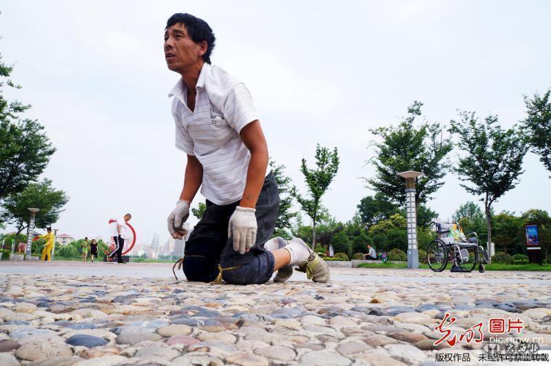 2016年06月27日,安徽省淮北市,清晨的阳光暖暖地照在桓谭公园的一块空地上。现年38岁下肢瘫痪的的姚俊杰,双手带着破损的手套,双膝用绳子捆上几层棉布,在铺满鹅卵石的地面上一圈圈地跪爬着,引来众多晨练市民惊奇和佩服的目光。