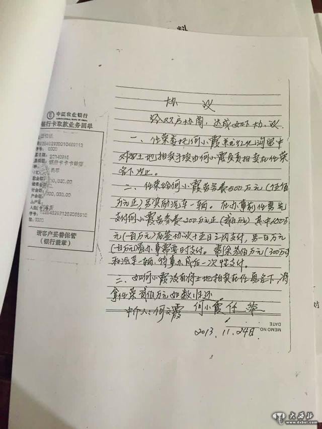 本报记者获得的一份由何小霞、任荣于2013年11月24日签定的协议显示,任荣委托何小霞就红化沟土地,由何小霞负责拍卖在任荣名下,任荣给何小霞劳务费500万元,另奖励小汽车一辆。该份协议落款的中介人为何文霞。据本报记者了解,何文霞为宝塔区干休所计生专干。