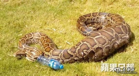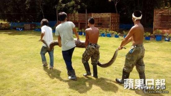 香港"贪食"蟒蛇吞下小羊爬不动 被4人抬走放生