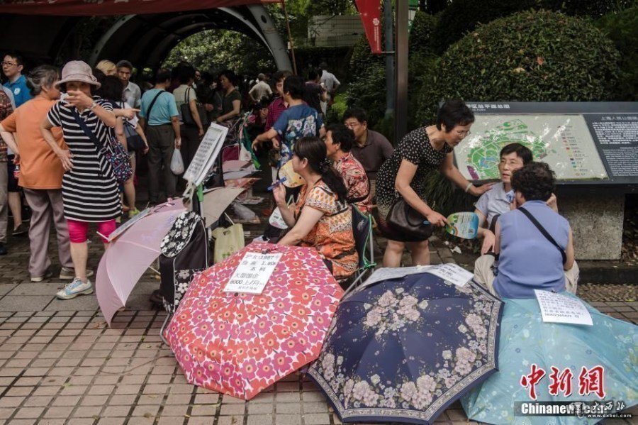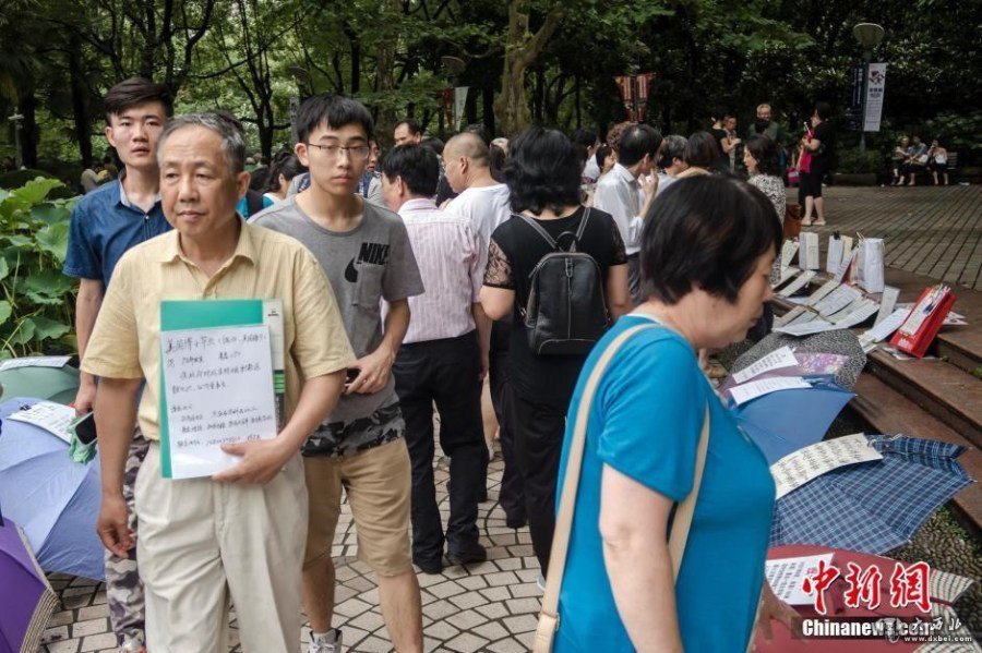 2016年7月3日,位于上海黄浦区人民广场内的相亲角内,聚集了大量为儿女寻觅“另一半”的家长。这些为儿女来此相亲的的父母,把一把把伞放在路边,贴上写有自己儿女相亲要求的纸条,遇到合适的家长就相互交流,互换联系方式。