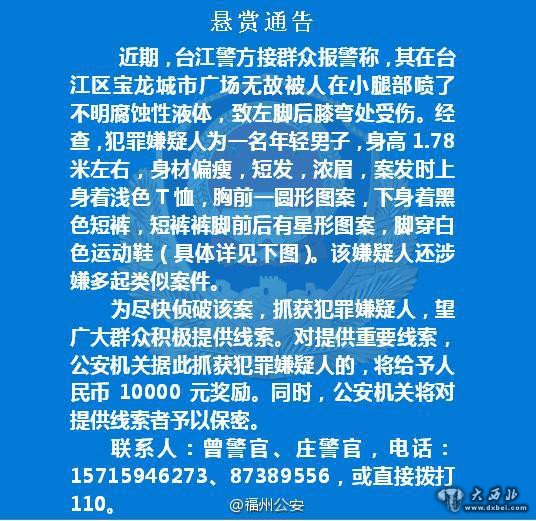 @福州公安 7月5日消息,福州警方悬赏追缉在宝龙城市广场喷不明腐蚀性液体的男子。近期,福州台江警方接群众报警称,其在台江区宝龙城市广场无故被人在小腿喷了不明腐蚀性液体,致左脚后膝弯处受伤。经查,犯罪嫌疑人为一名年轻男子,身高1.78米左右,身材偏瘦,短发,浓眉,案发时上身着浅色T恤,胸前一圆形图案,下身着黑色短裤,短裤裤脚前后有星形图案,脚穿白色运动鞋。该嫌疑人还涉多起类似案件。