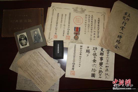 日前,江西德兴档案馆征集到侵华日军加滕诚三的私人档案,包括铜质“支那事变”从军记章及从军记章之证各1件、“支那事变行赏一时赐金袋”1件、赏金状1件、行赏金国库债券领取说明书3件、私人相册2册等共9件档案。这批档案从一个侵华日军普通士兵的角度,真实地反映了日本侵华的历史,是日本侵华的铁证,为研究日本侵华历史提供了实物佐证。黄鹤 摄
