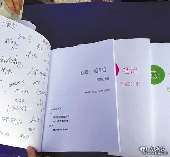 孟老师介绍,去年底,学生沈熠提出,同学们各自复习,效率不是很高,建议按擅长的科目分工,编写复习资料后共享。随后,同学们分成6个组,在任课老师的帮助下,按科目整理出复习资料。同学们拿到复习资料后,普遍反映帮助很大。高考结束后,大家决定把资料与学弟学妹分享,将6门科目整合成“语英”、“数学”、“理科综合”三册一套的《噫!笔记》,校对、装帧、编辑等工作均由学生完成。