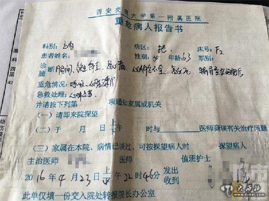 一到西安,医院就给方阿姨下了重危病人报告书,上面写着输异型红细胞后,呼吸、心脏骤停。