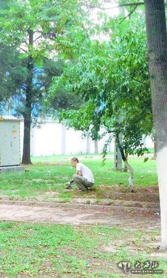 目击者拍下照片显示,绿地内一位中年男子半蹲着,一只手上戴着厚厚的棉手套,手边是一只棕色的猛禽。由于拍摄者离得较远,从照片上无法判断这只猛禽的种类。目击者说,这位大叔正在拿着灰喜鹊去喂食猛禽。根据目击者提供的位置,记者找到了这片绿地。地面上,仍然留有大片的羽毛。