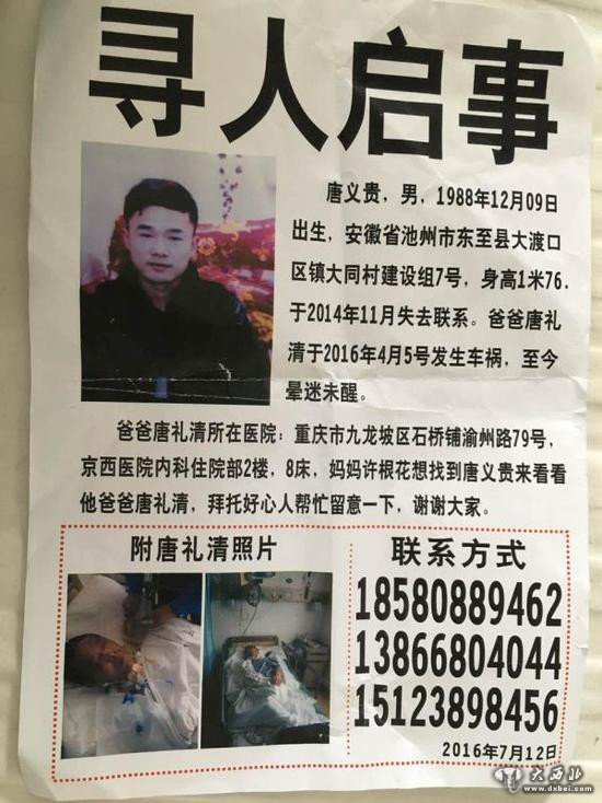 许根花说,唐义贵2012年去深圳打工,中间换了几个工作单位,后来他们托人去问,对方都说唐义贵早已辞职离开,不清楚他的行踪。