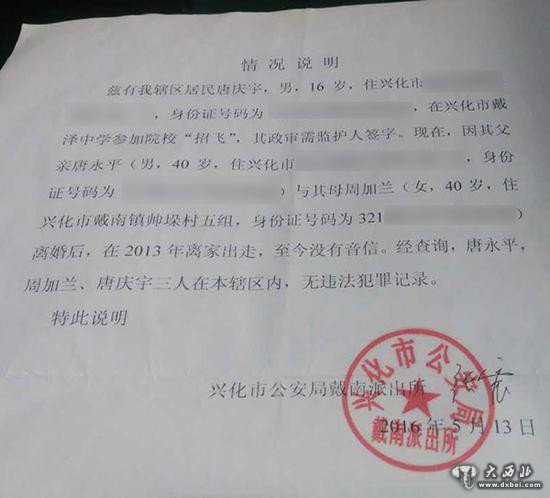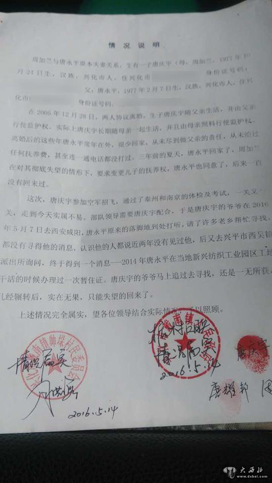 尽管得知“已通过了”空军青少年航空学校考试,但15岁的江苏泰州少年唐庆宇却高兴不起来,因为他被告知,由于其父亲的“缺席”、导致其政审受阻,他或将面临着无法入读空军航空学校的局面。