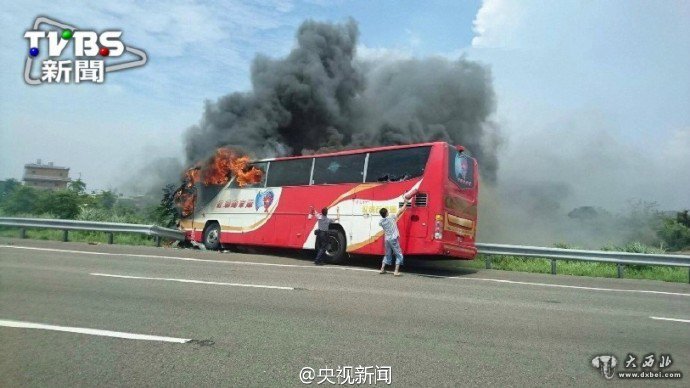 有网友行经当时火烧车地点,用手机拍下,当时车身上写着“红珊瑚通运公司”的游览车,车头撞击路肩后起火。现场熊熊的火势冒出浓浓黑烟,但拍下的影片中,并没有看到任何人在游览车附近。