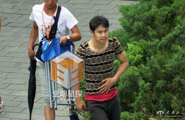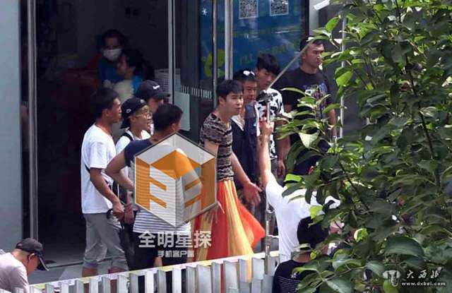 小沈阳身穿条纹上衣,而他的下身则是一条橘色长裙,看来小沈阳刚刚拍摄完男扮女装的片段。