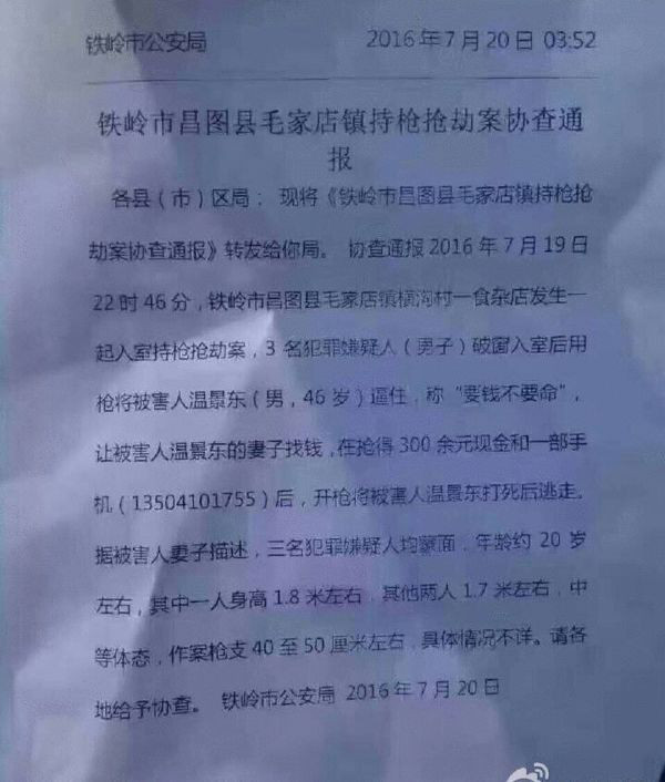 20日,有网友在微博上曝出了一份铁岭市公安局当日凌晨3:52发布的内部协查通报照片。通报称,2016年7月19日晚10:46,铁岭市昌图县毛家店镇横沟村一食杂店发生一起入室持枪抢劫案。