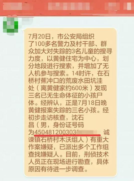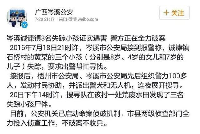 7月20日晚21时17分,岑溪公安发布通稿称,诚谏镇3名失踪小孩证实遇害,警方正在全力破案。