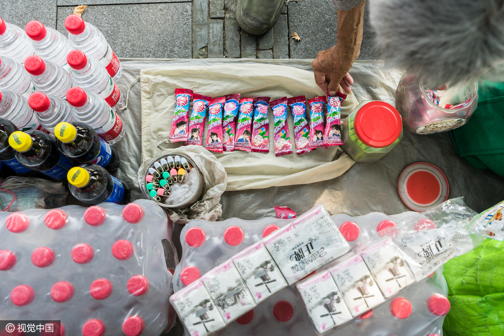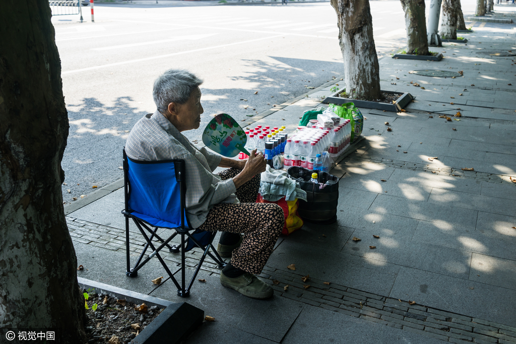 老太在摊位前扇风消暑。