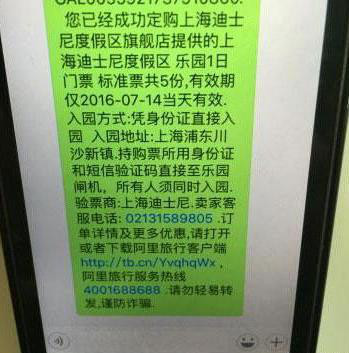 购买成功后阿里旅行发来的短信。