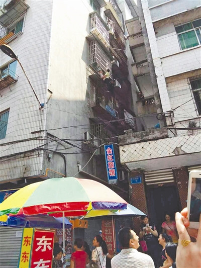 站在3楼的防护栏上,鲜均担心脚下的防护栏承受力,他右手抓住4楼防护栏慢慢移步,终于,他用左手一把抱住了男童。鲜均一边安抚哭闹的男童,一边将右腿弯曲,让男童将双脚站在自己的右腿上。